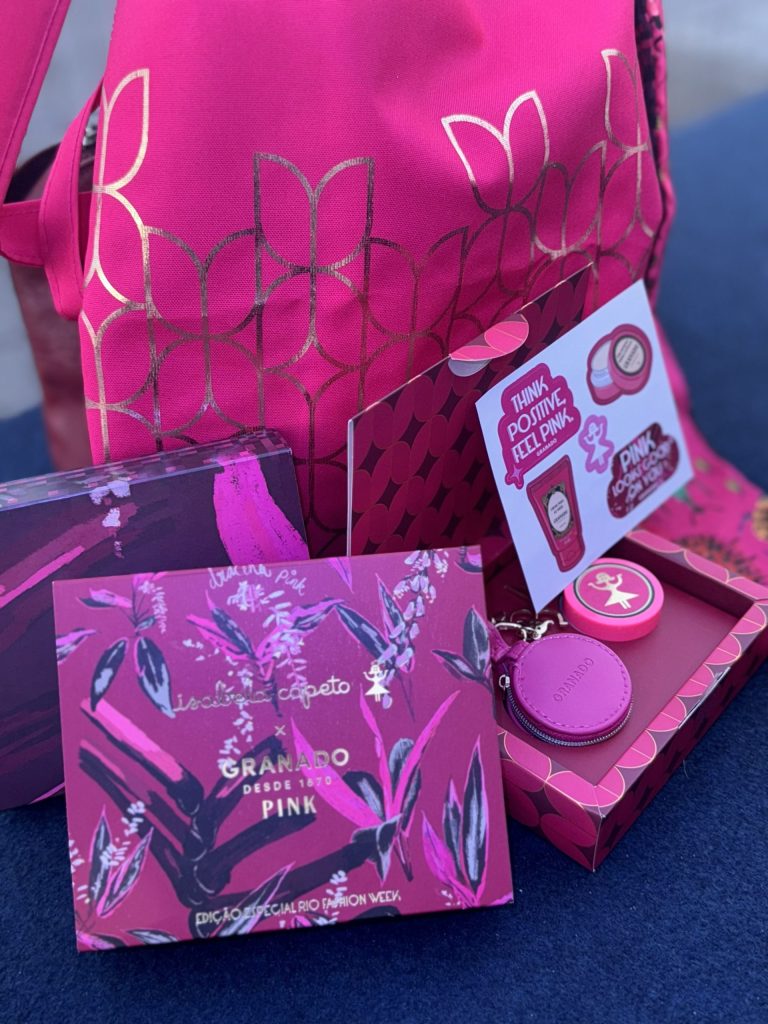 A Granado também marcou presença no desfile, com as modelos levando um charm da cerinha Pink nos looks. Faz sentido: uma marca carioca com décadas de história, conhecida pelo artesanal e pelo cuidado, combinando com uma estilista que tem exatamente esses mesmos valores. Além da passarela, a Granado ainda montou um espaço no evento com esmaltação gratuita e personalização de kits da linha Pink, levando a experiência pra além do desfile.