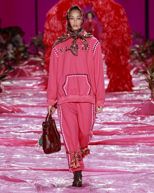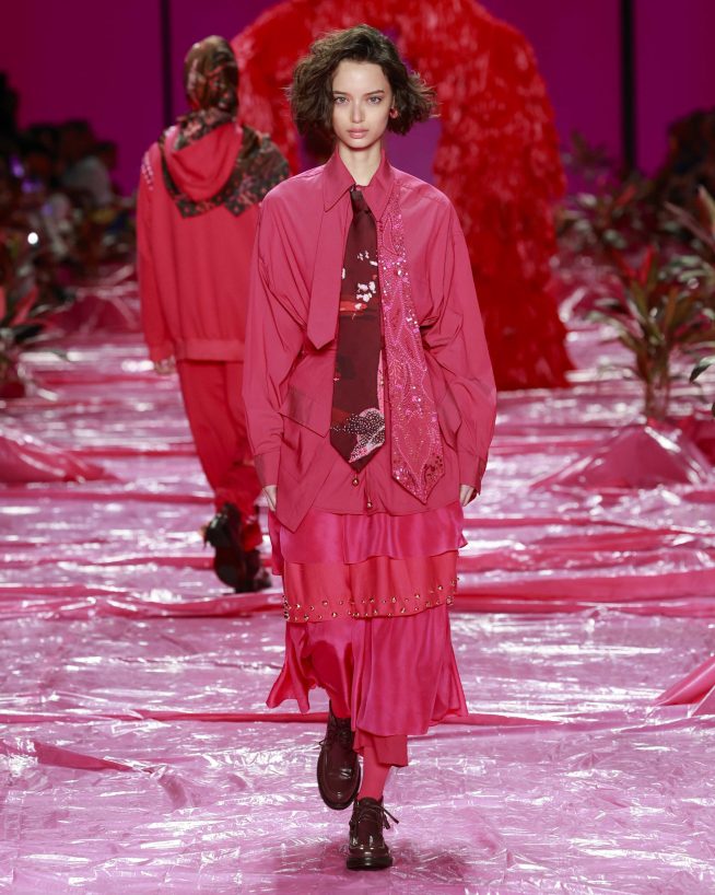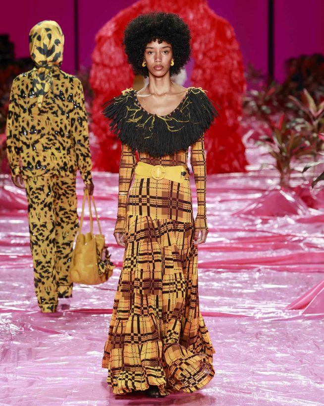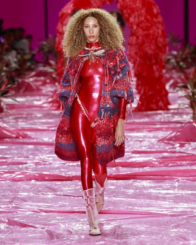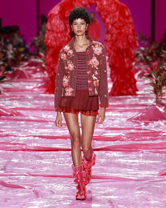 Fúcsia, vermelho e amarelo cevada dominaram a paleta. As peças vieram com: bordados, paetês, penas, tule, veludo, renda, lamê, calças de lona com desenhos de besouros, batas com babados, vestidos longos, saias rodadas.